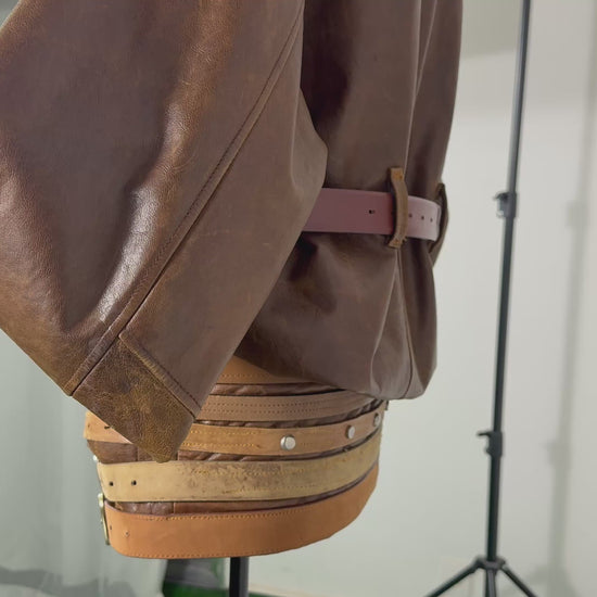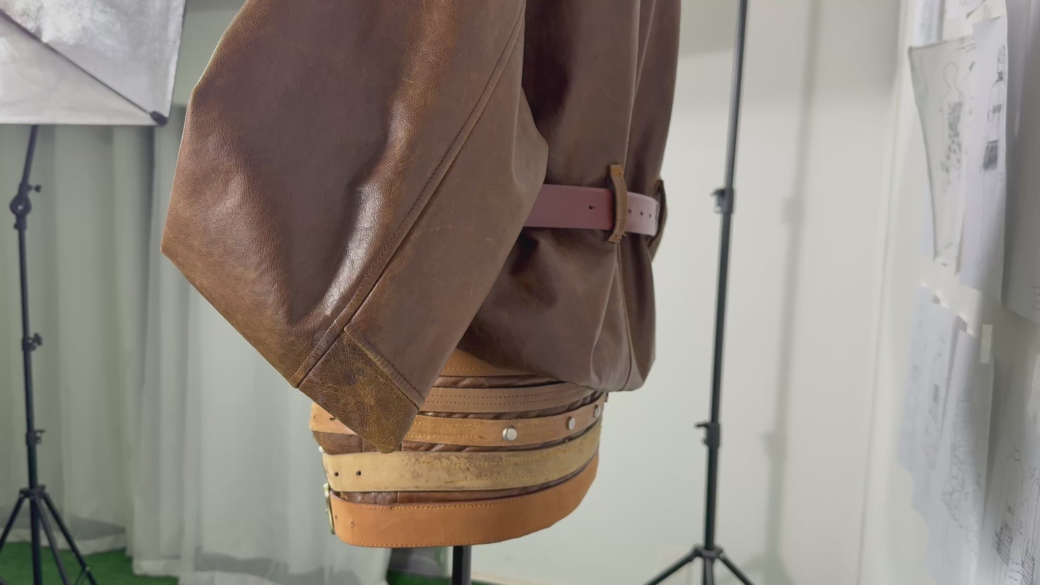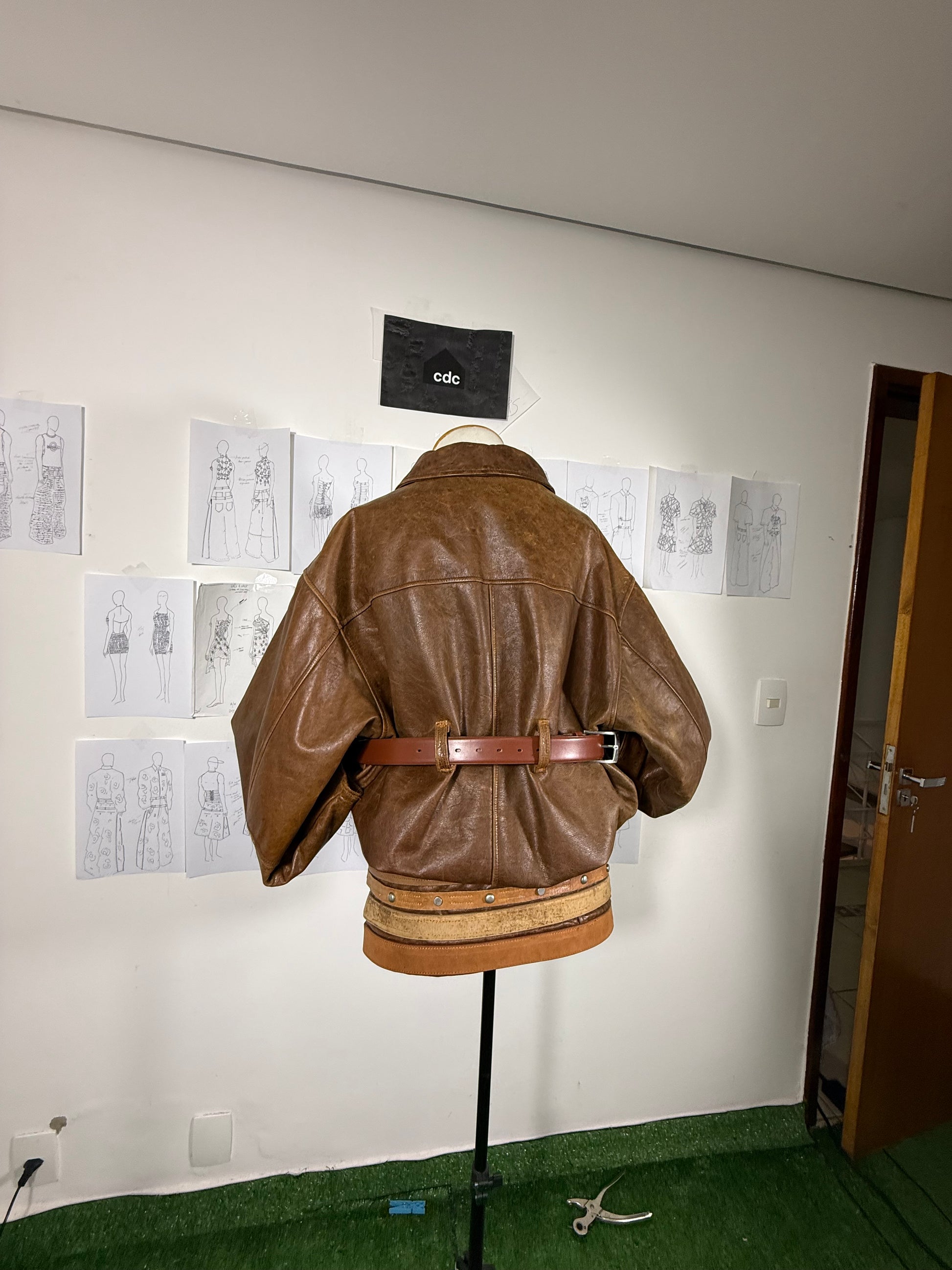 Jaqueta em upcycling, feita com o mesmo couro da parka Timberland que originou a saia. Totalmente remodelada: nova gola, novo zíper, reconstrução completa da estrutura e um efeito balonê na cintura, e forro interno. Conta também com um cinto traseiro acoplado, que ajusta a peça e reforça o volume característico. Tom marrom/caramelo, modelagem box