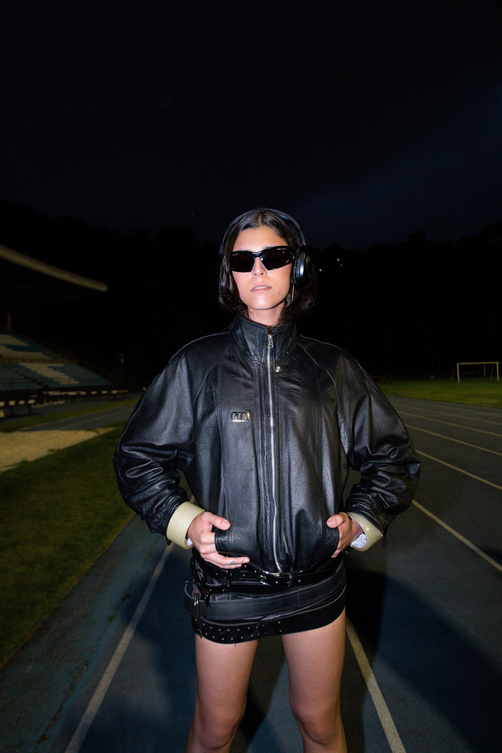 Jaqueta "cropped" com plissados na parte traseira, cinto na extremidade da cintura formando a nova silhueta, e acabamentos em metal prateado.