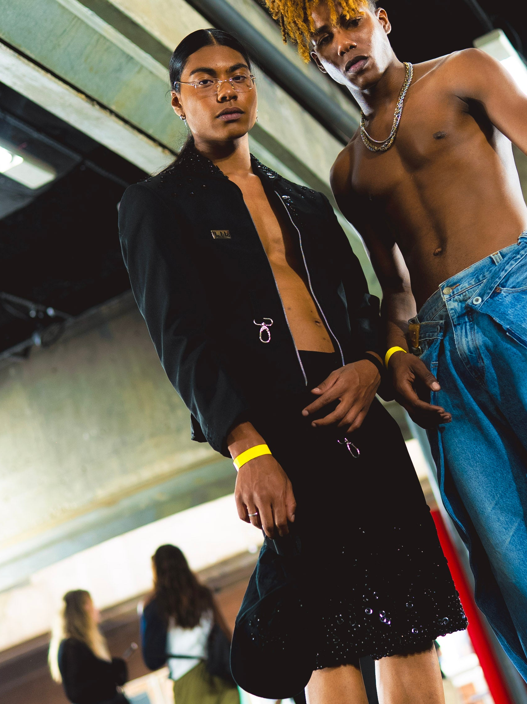 • Botões acrílicos pretos aplicados na gola e descendo pela peça, criando ilusão de brilho/pedraria quando a luz bate