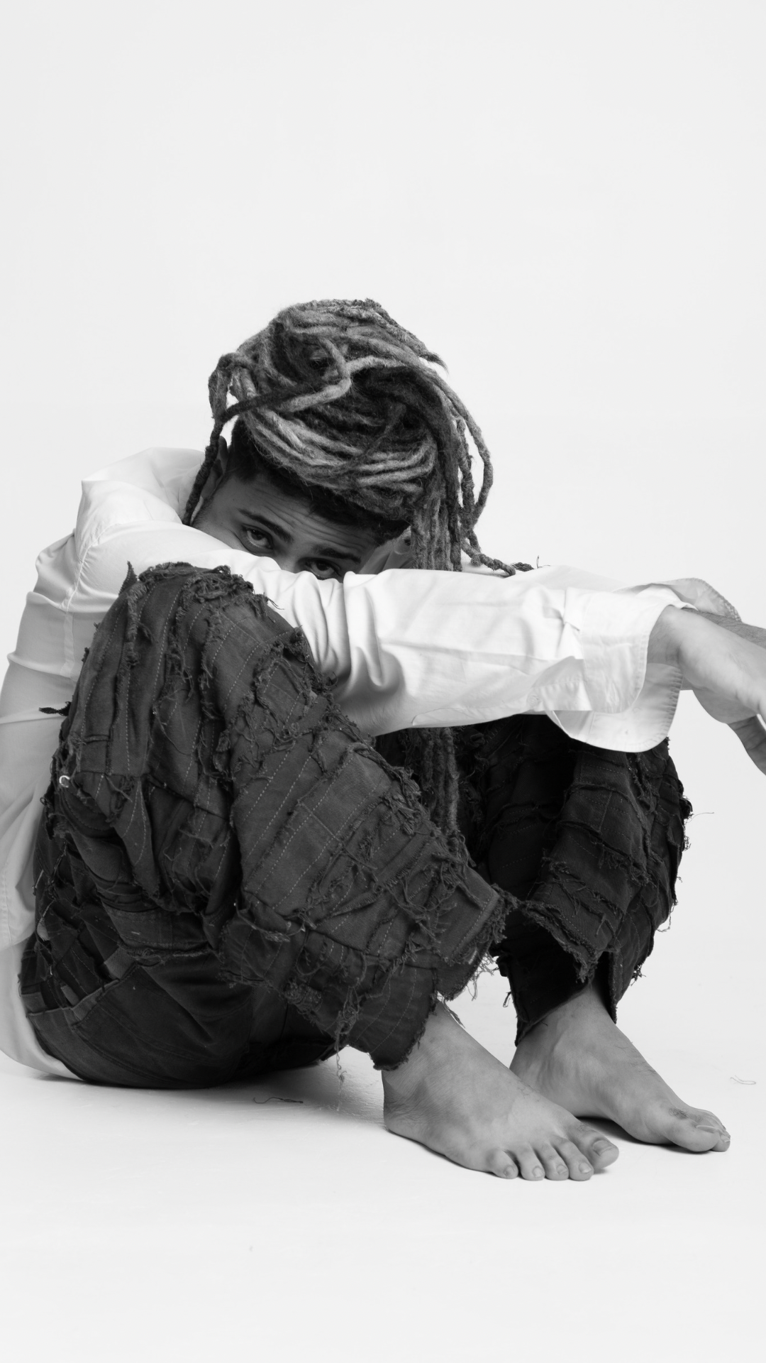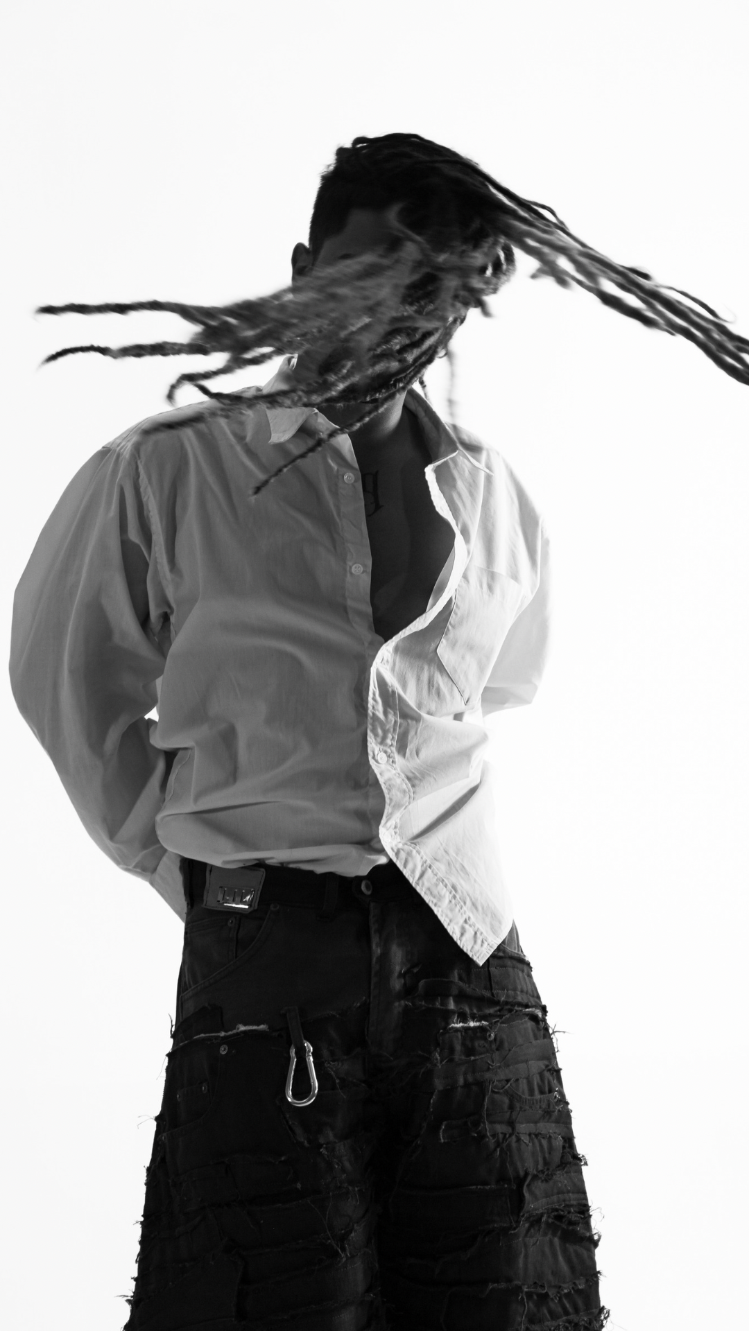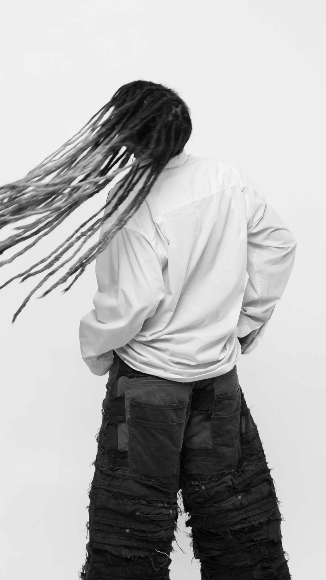 O design (em upcycling) conta com modelagem ampla, caimento "baggy", e destalhes desfiados em jeans por toda a peça.