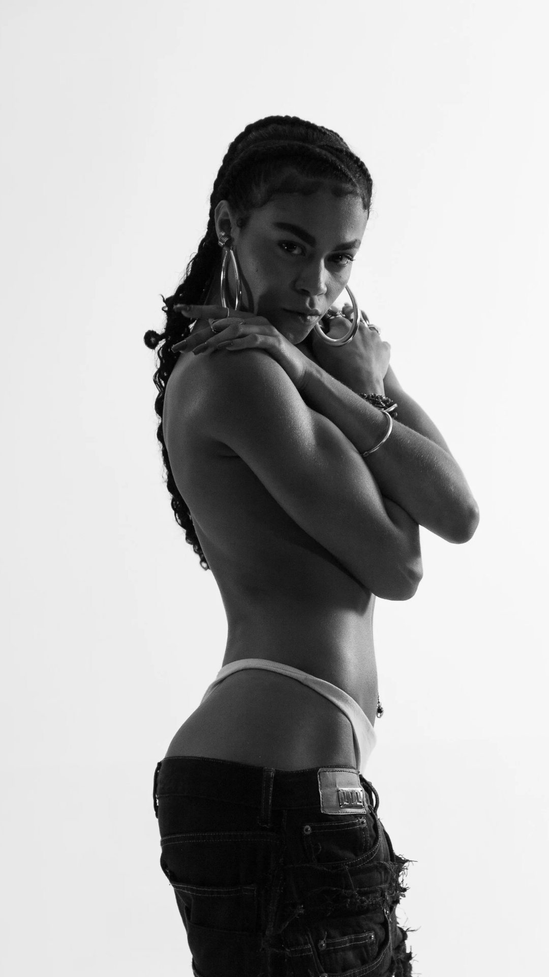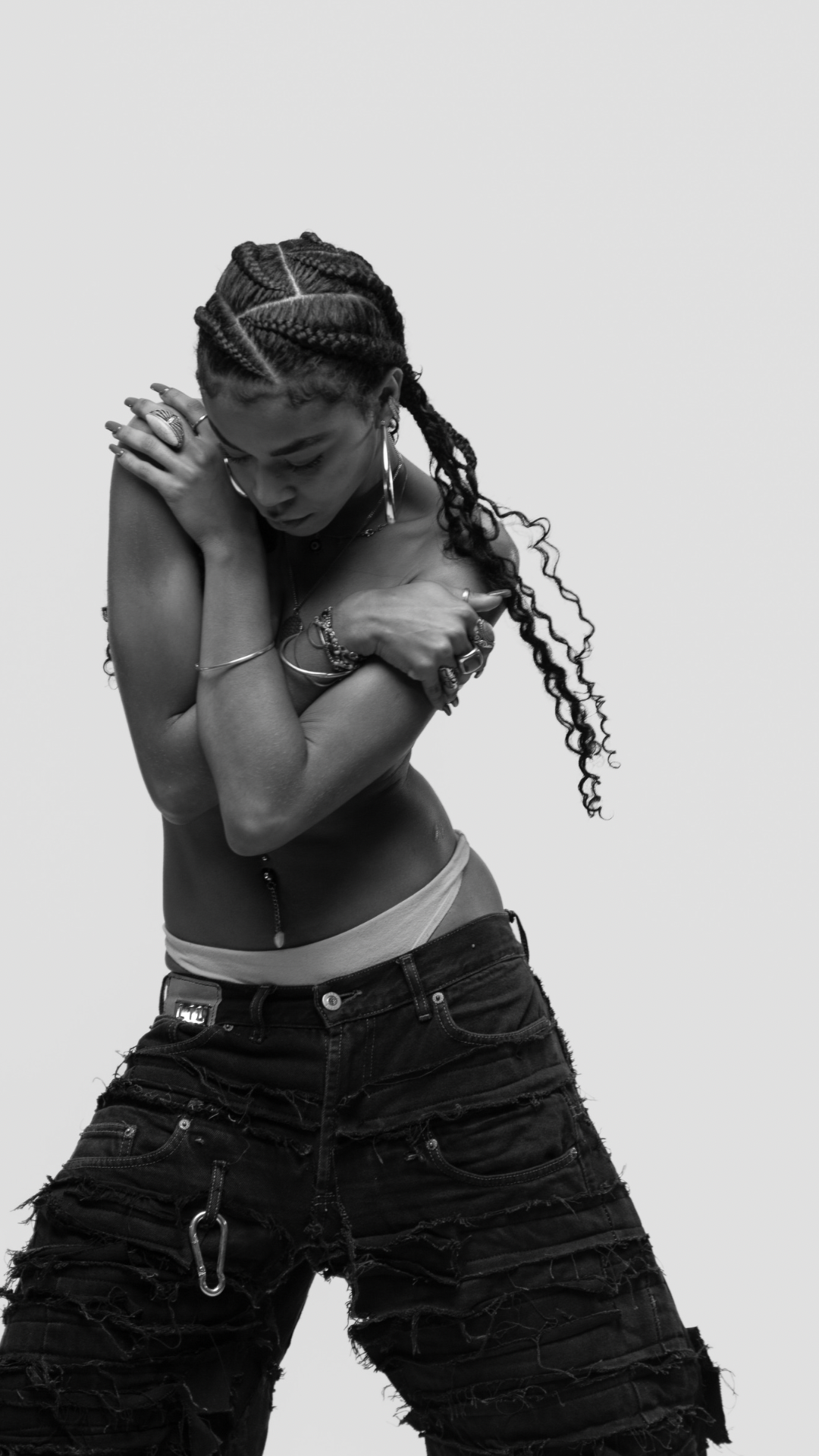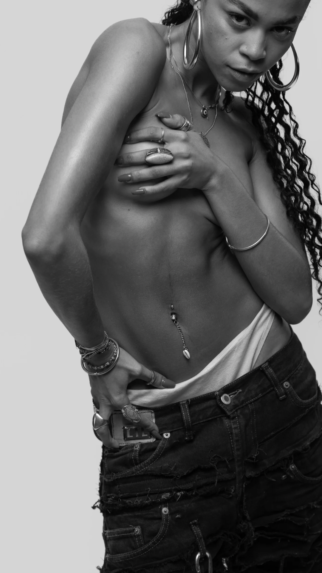 O design (em upcycling) conta com modelagem ampla, caimento "baggy", e destalhes desfiados em jeans por toda a peça.