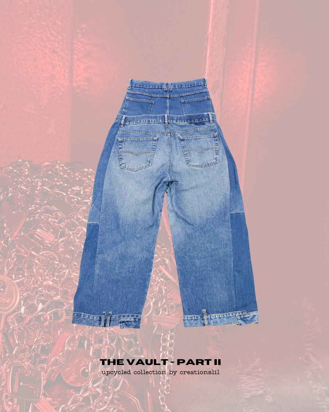 Calça Jeans upcycled, com modelagem "baggy" e cintura dupla.