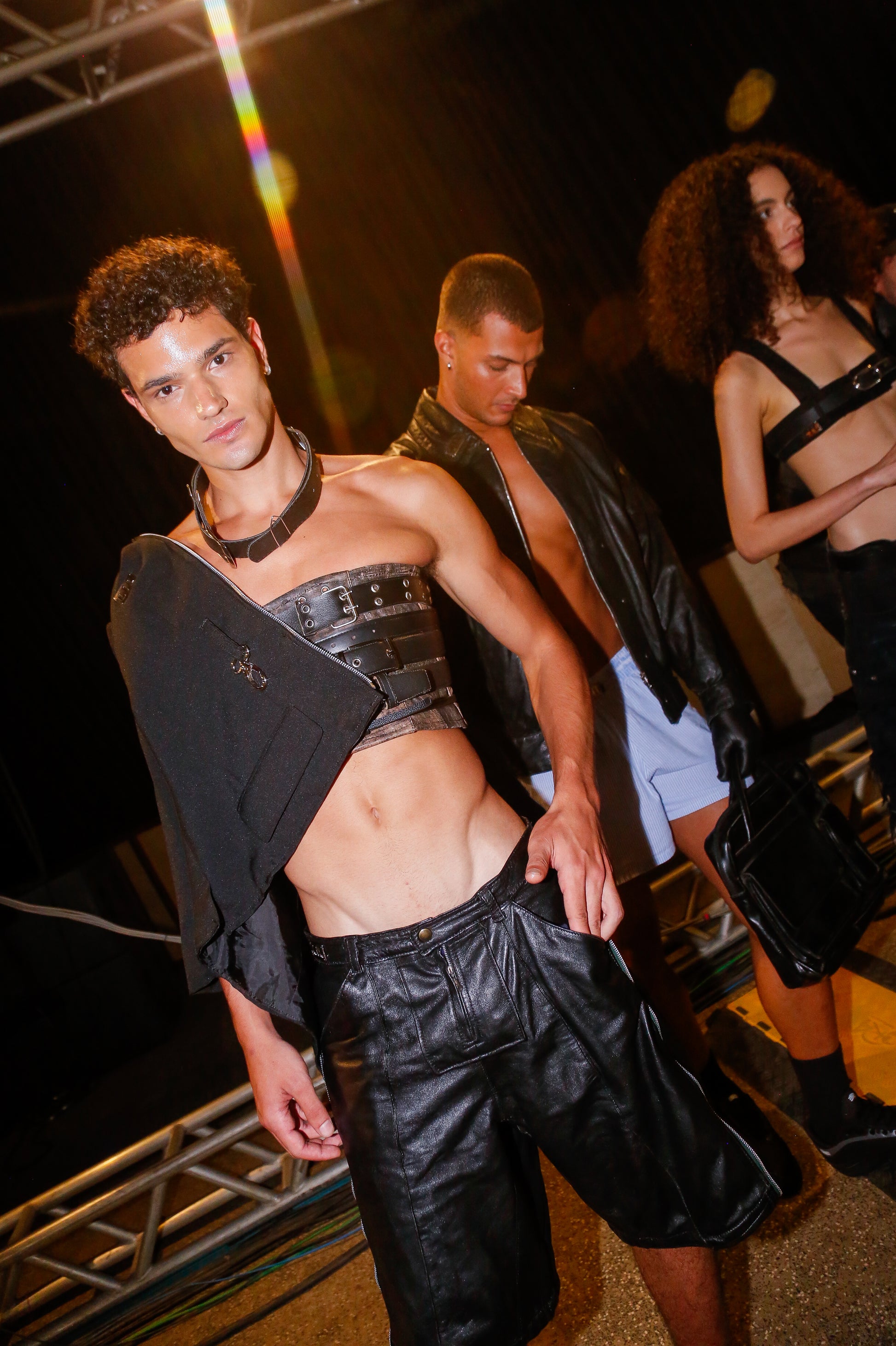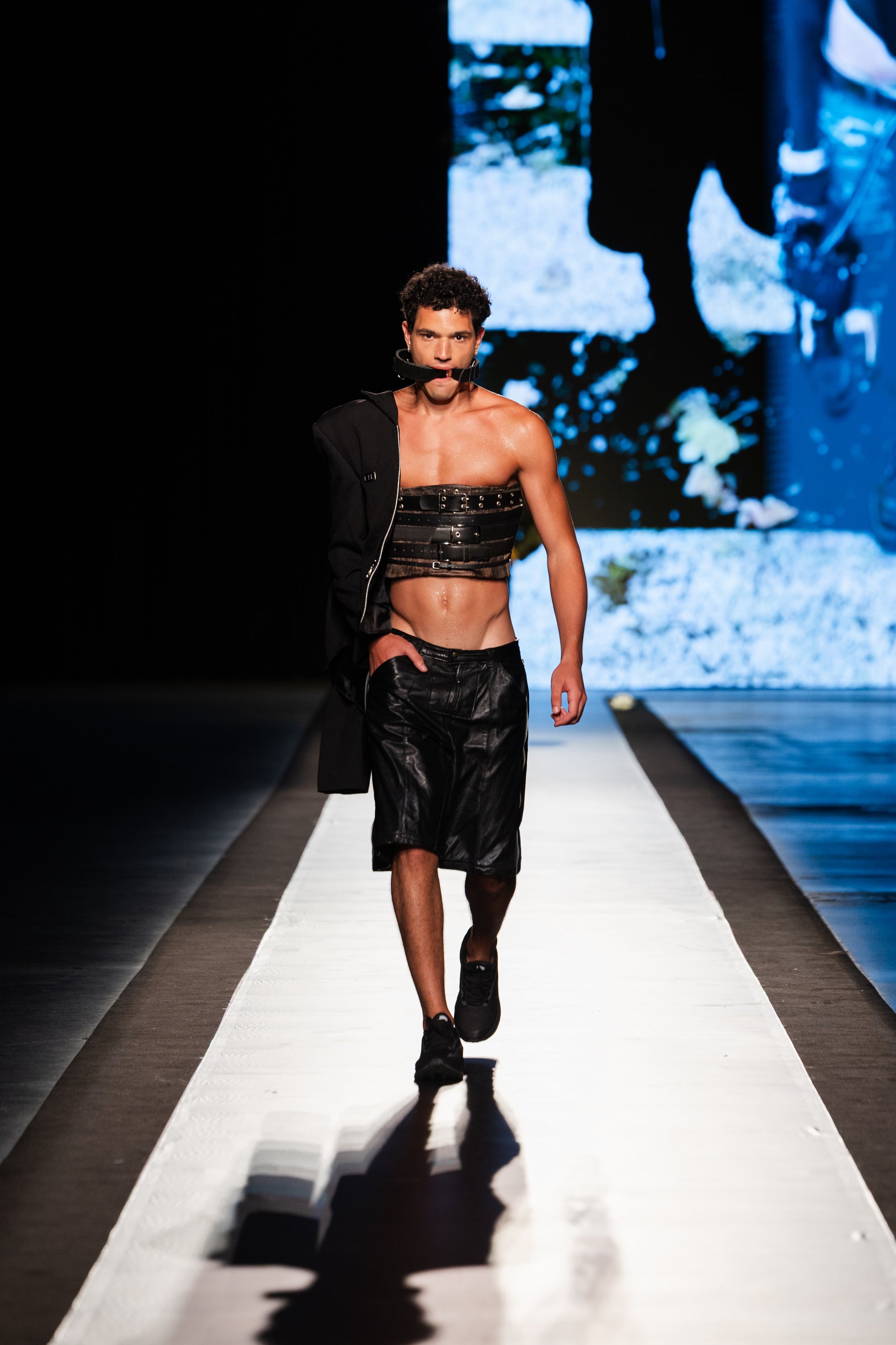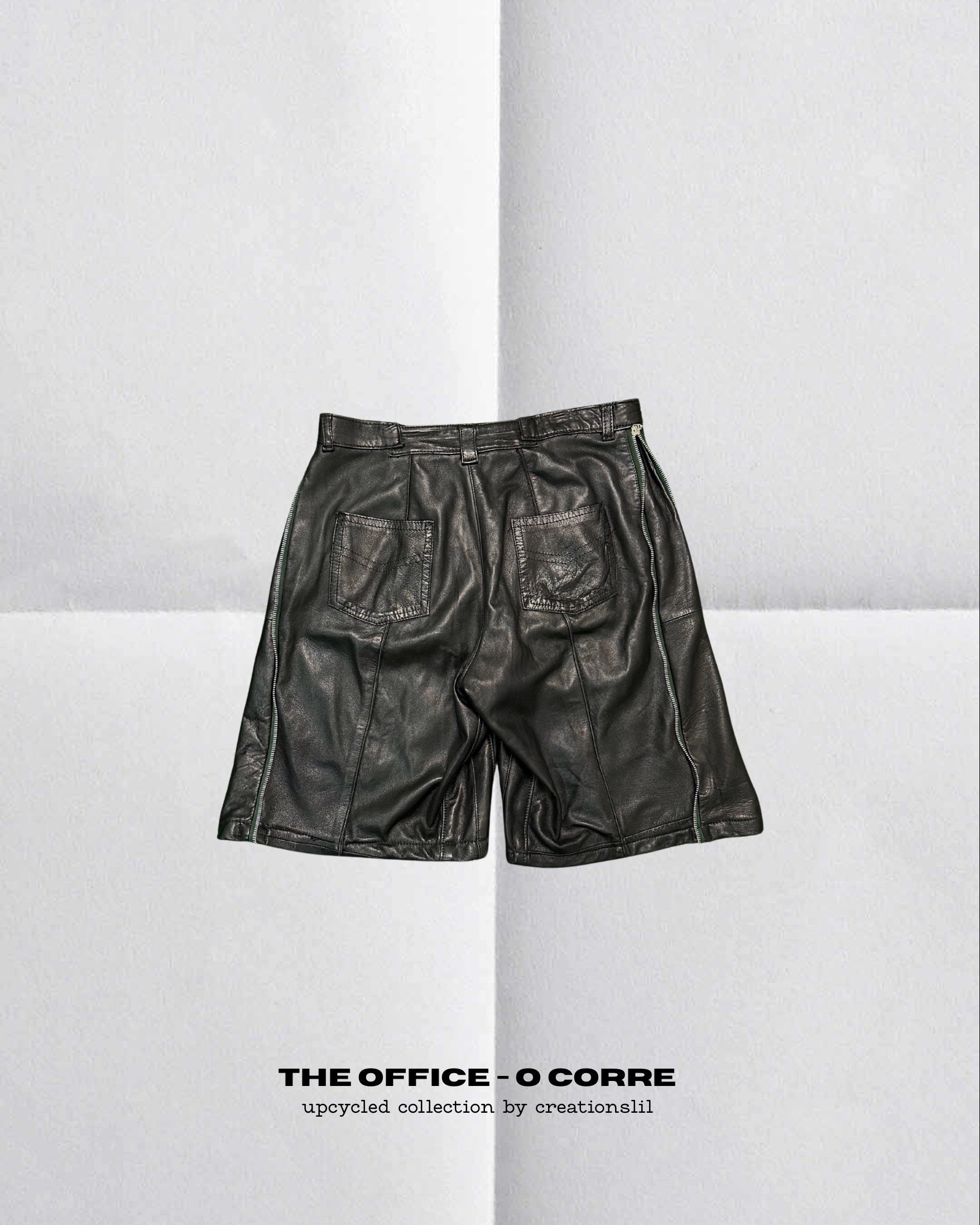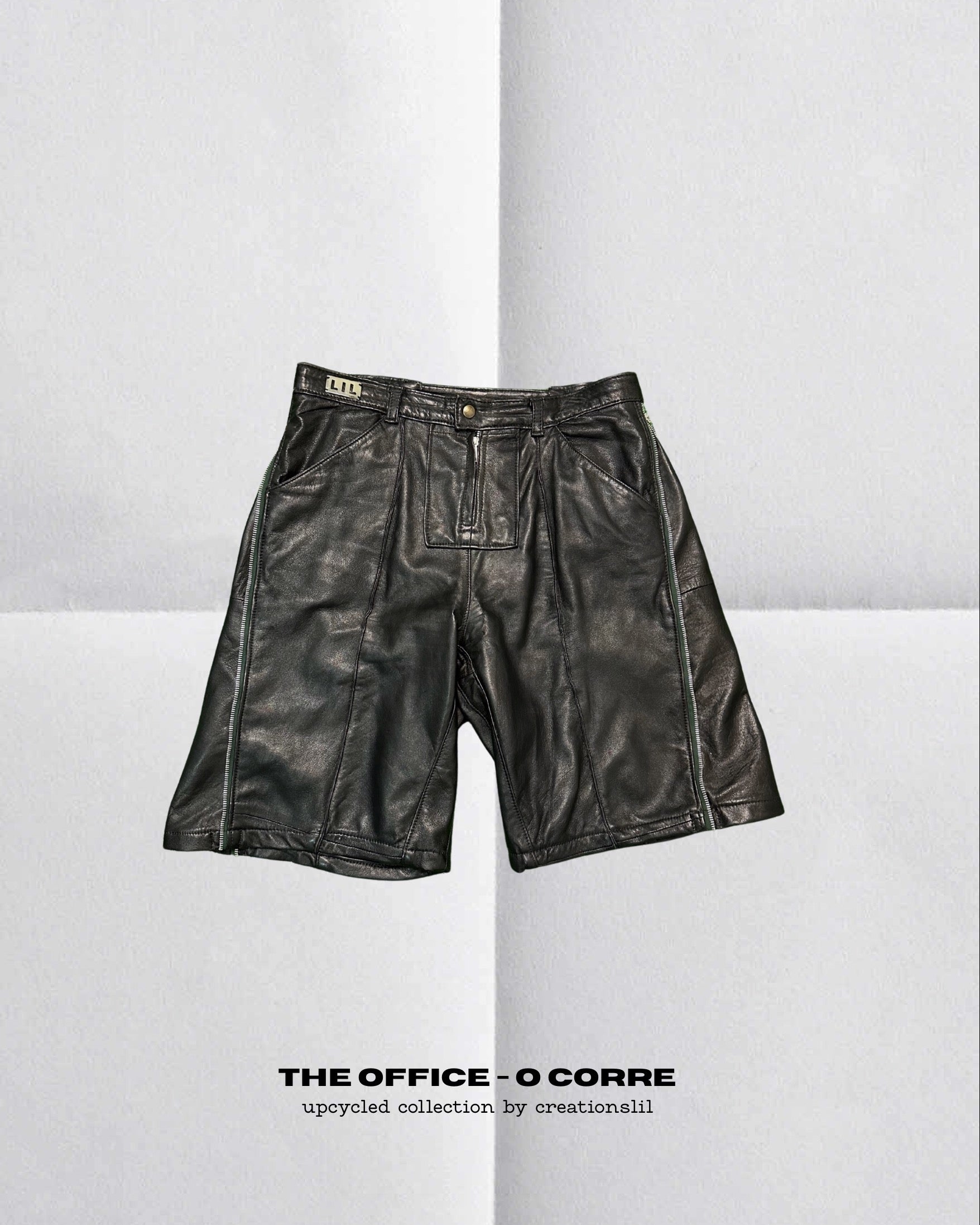 Upcycling desenvolvido a partir de duas calças de couro descartadas e rasgadas.
