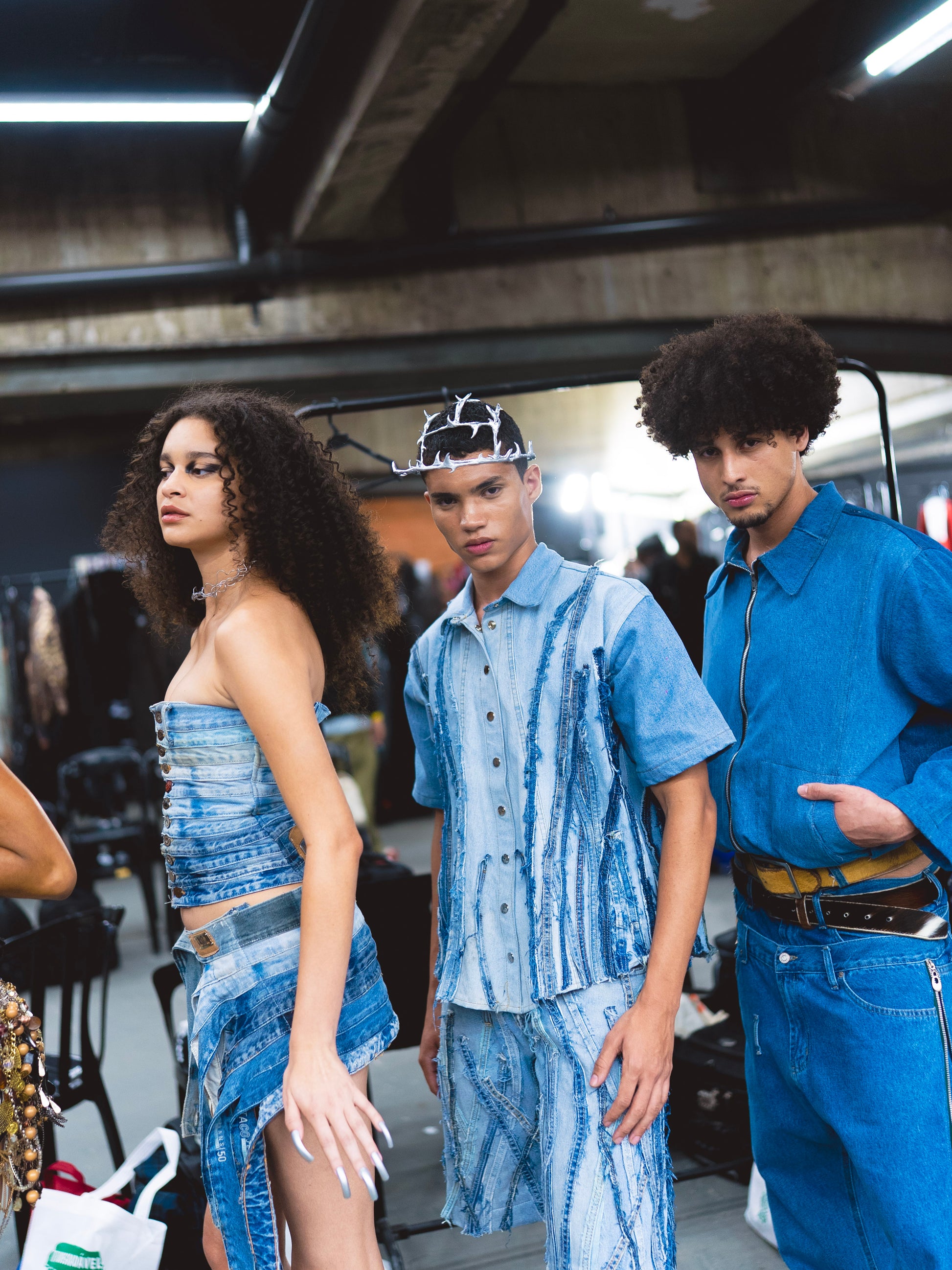 • Criação de estampa exclusiva feita a partir de retalhos de denim — as “tripas do jeans”, as costuras internas das pernas, organizadas em degradê