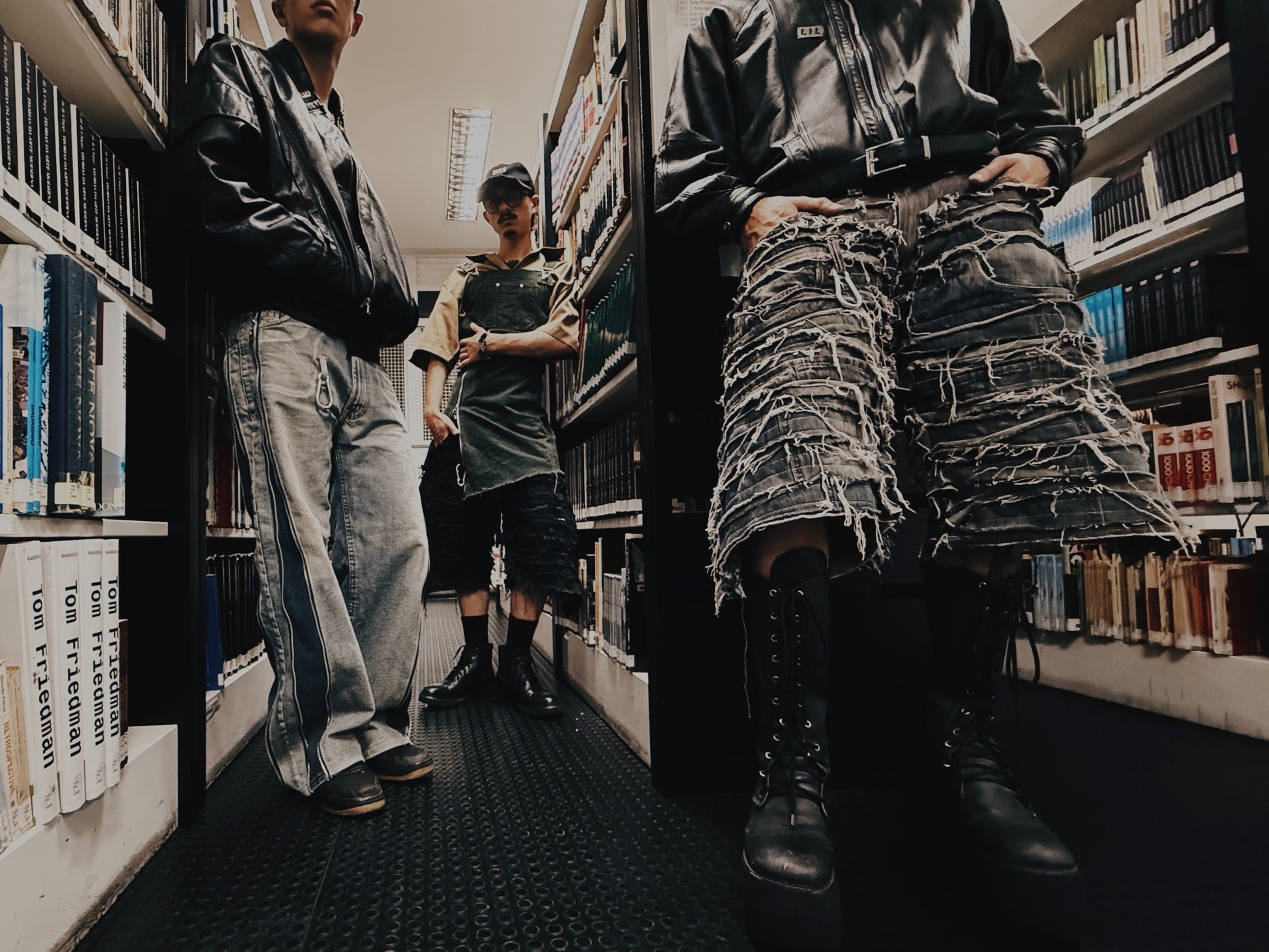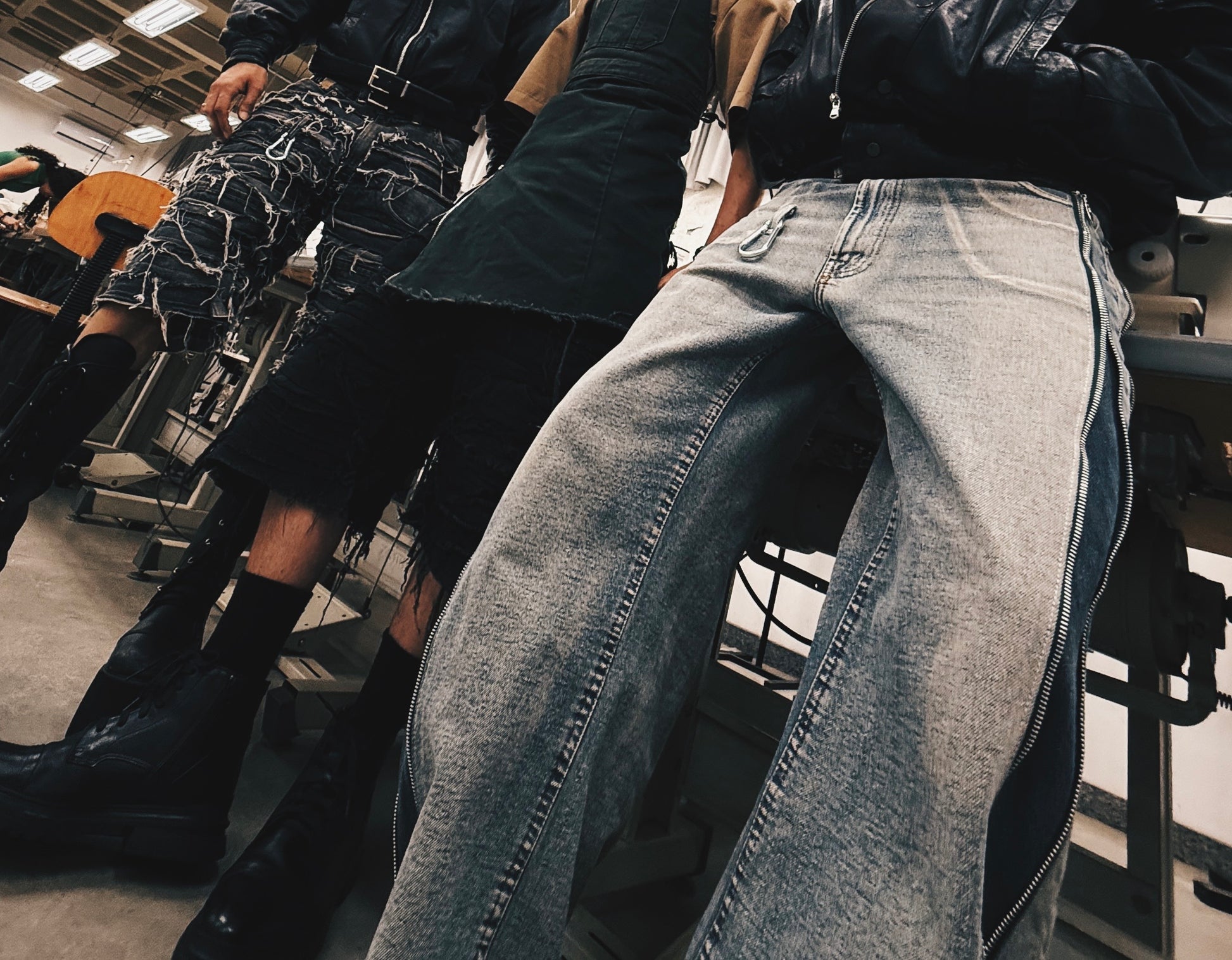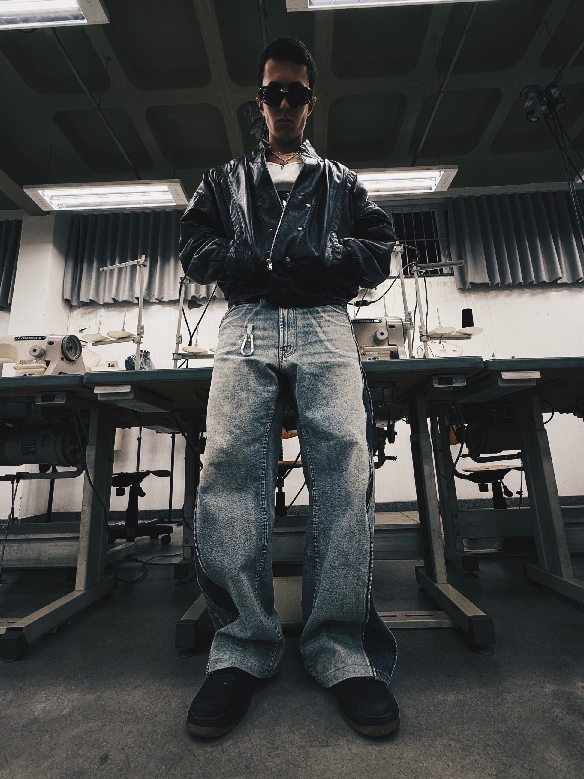 A peça é feita em um unico tom, com jeans 100% algodão e reciclado (upcycling) em cinza claro.