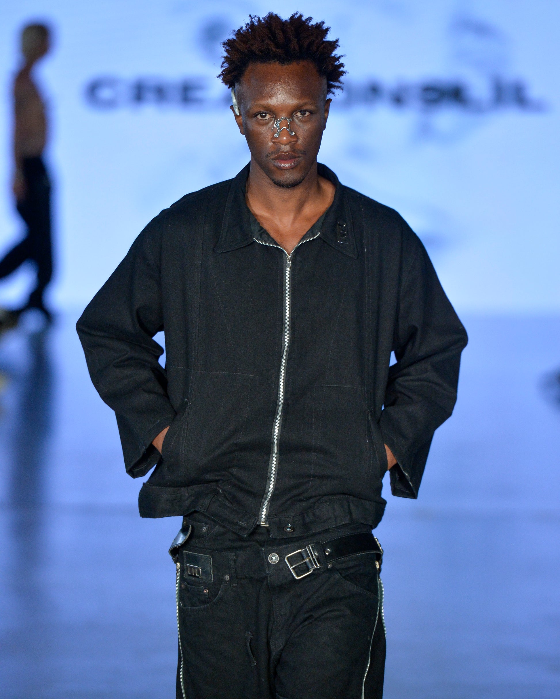Jaqueta preta upcycled, construída a partir de denim estruturado, reinterpretado em nova modelagem. O acabamento recebe cortes e cores aplicadas na barra, reforçando o caráter artesanal e experimental da peça.