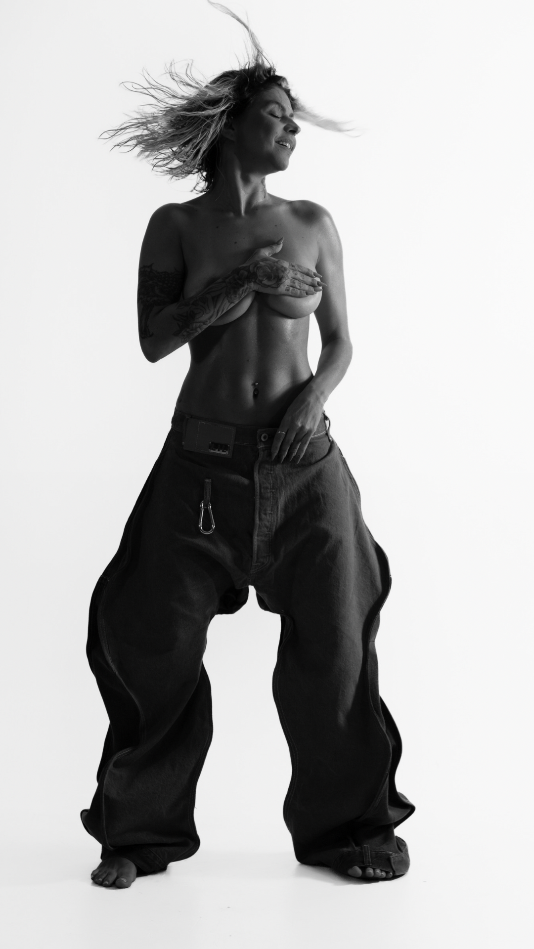 O design em upcycling, feito em jeans baggy, tem formato "loose" com recortes que formam ondas, distorcendo e despertando o imaginário de calças desconstruídas.