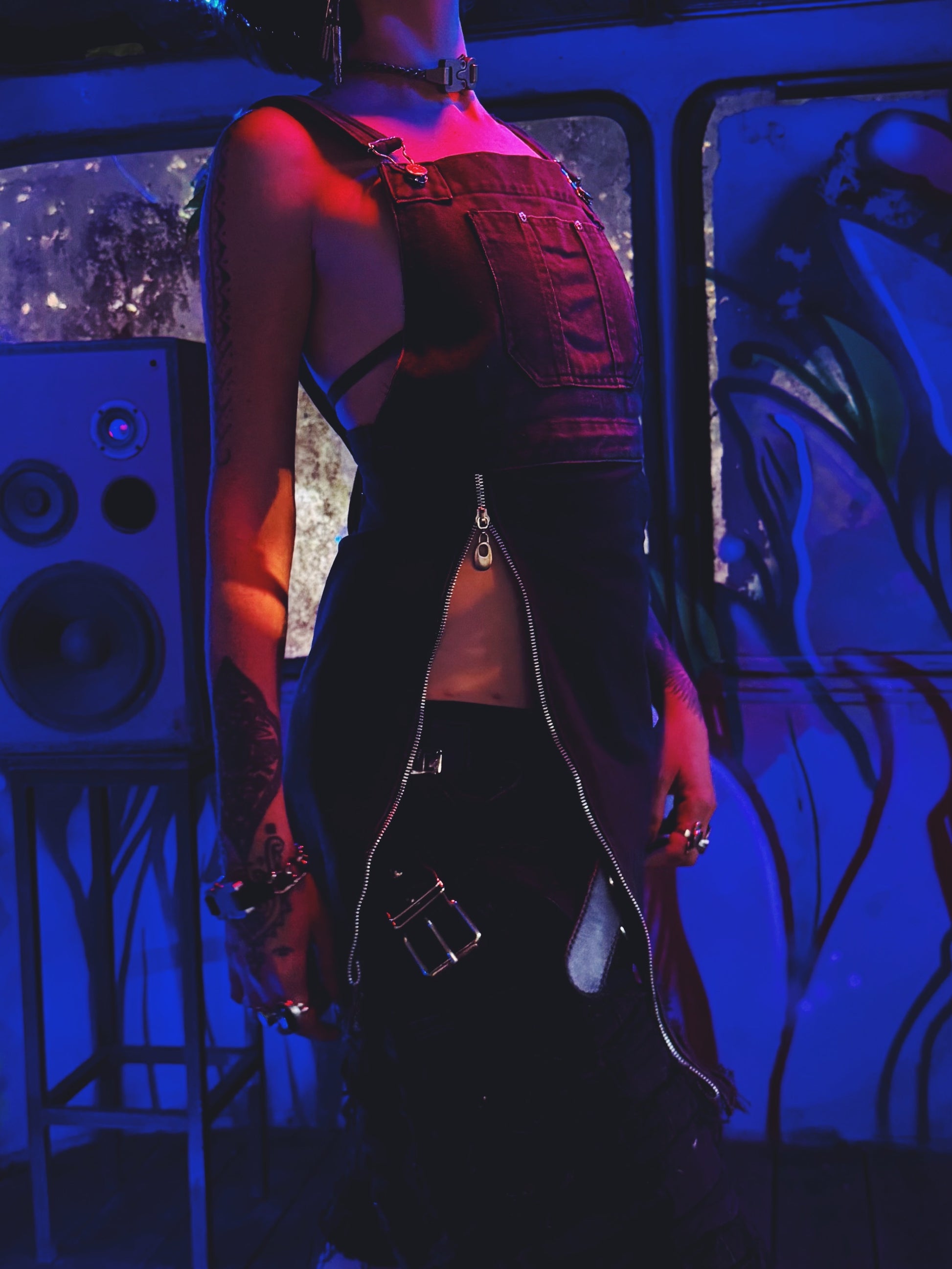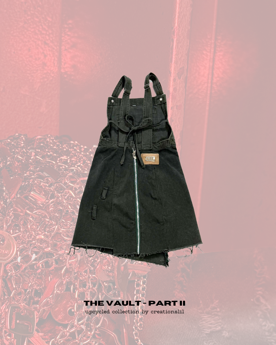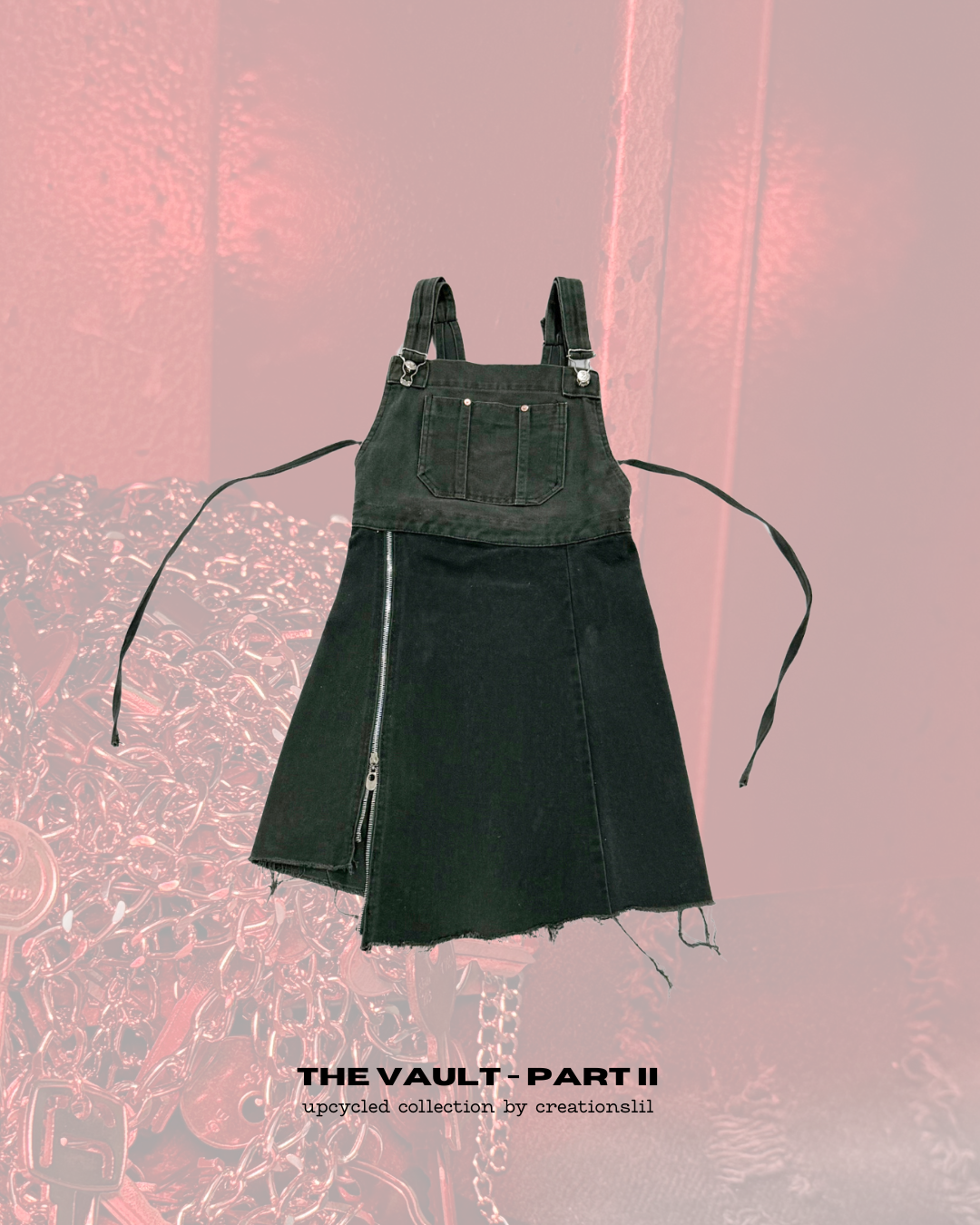 O vestido (em upcycling) foi remodelado através de um macacão vintage descartado.
