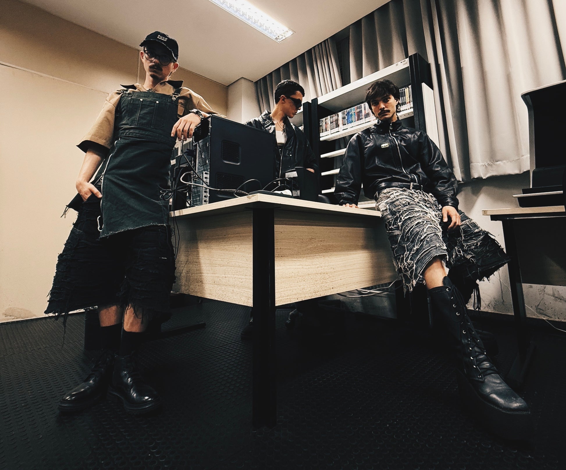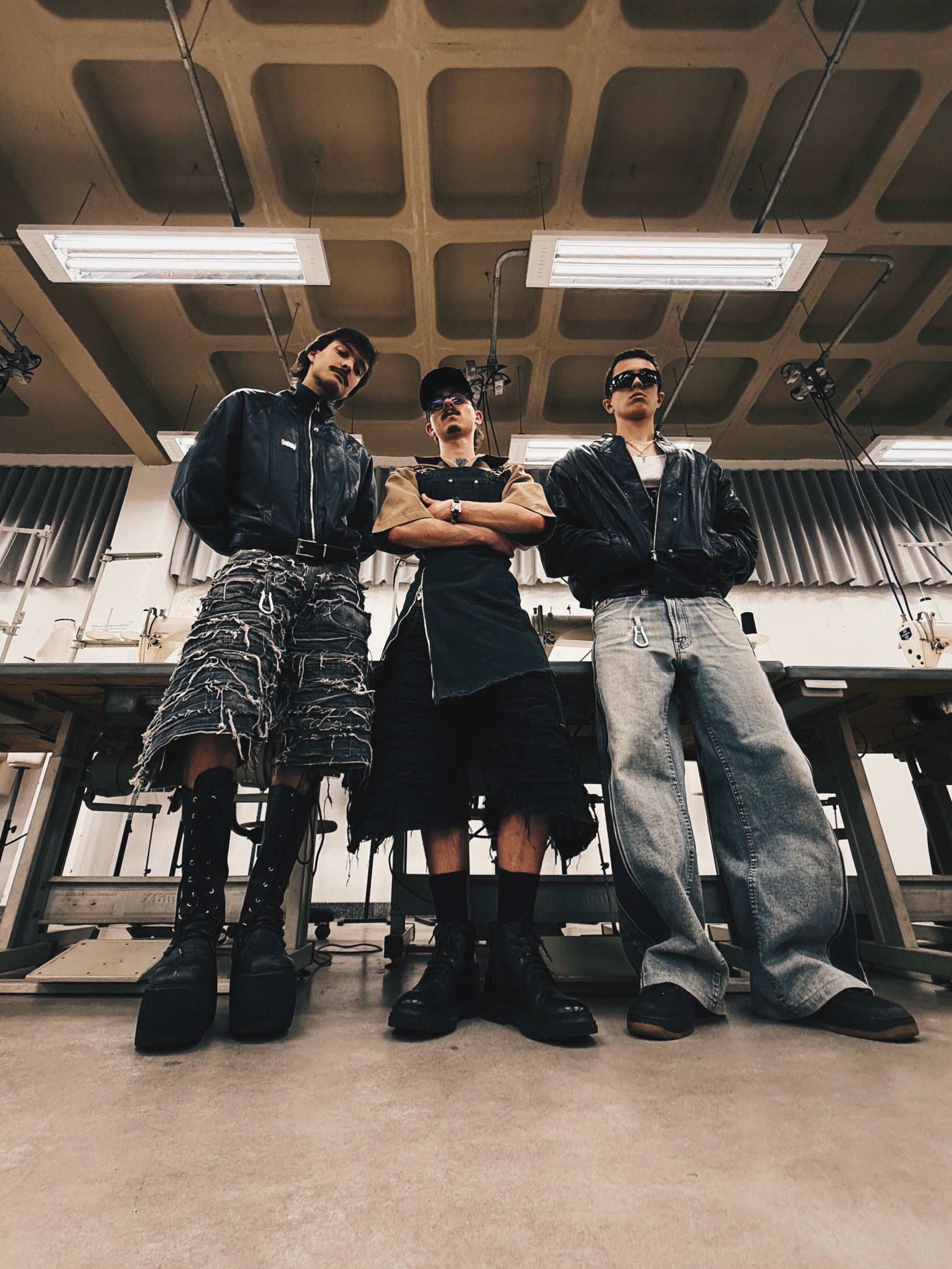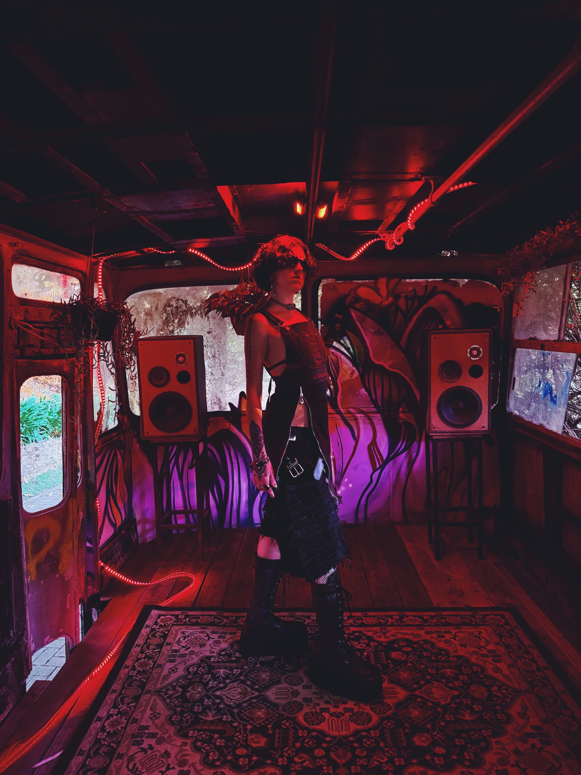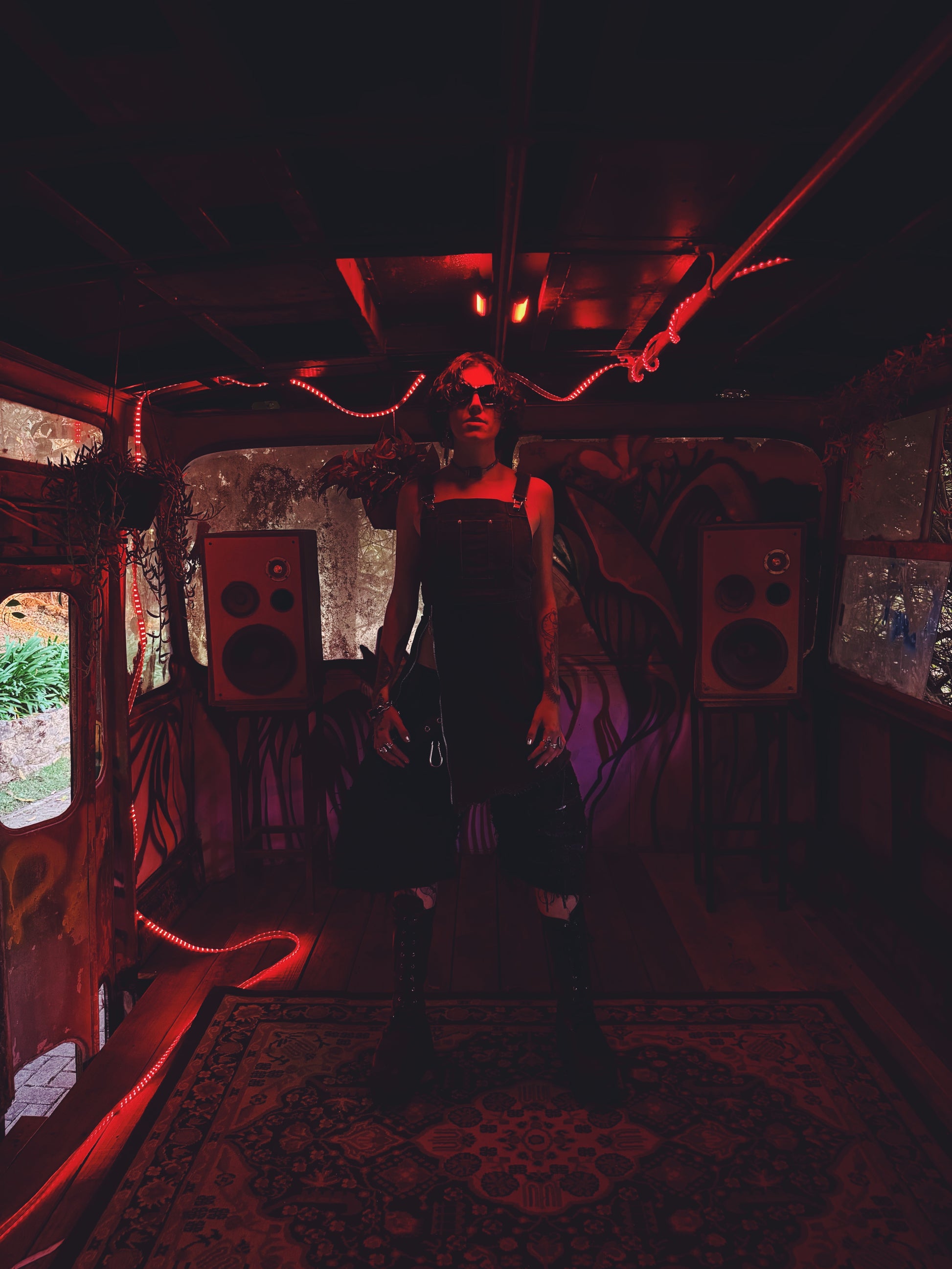 O vestido (em upcycling) foi remodelado através de um macacão vintage descartado.